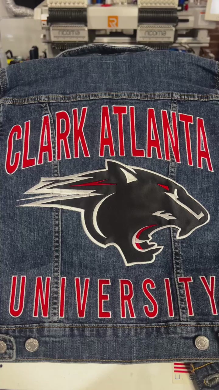 This Levi Denim is expertly embroidered with the Clark Atlanta design using the direct-to-garment method.